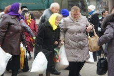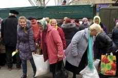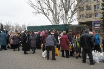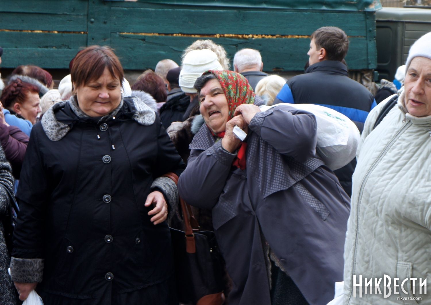 Среди тех, кто получили продукты, были преимущественно жители Жовтневого района. Они рассказали, что в набор входят различные крупы и соль.