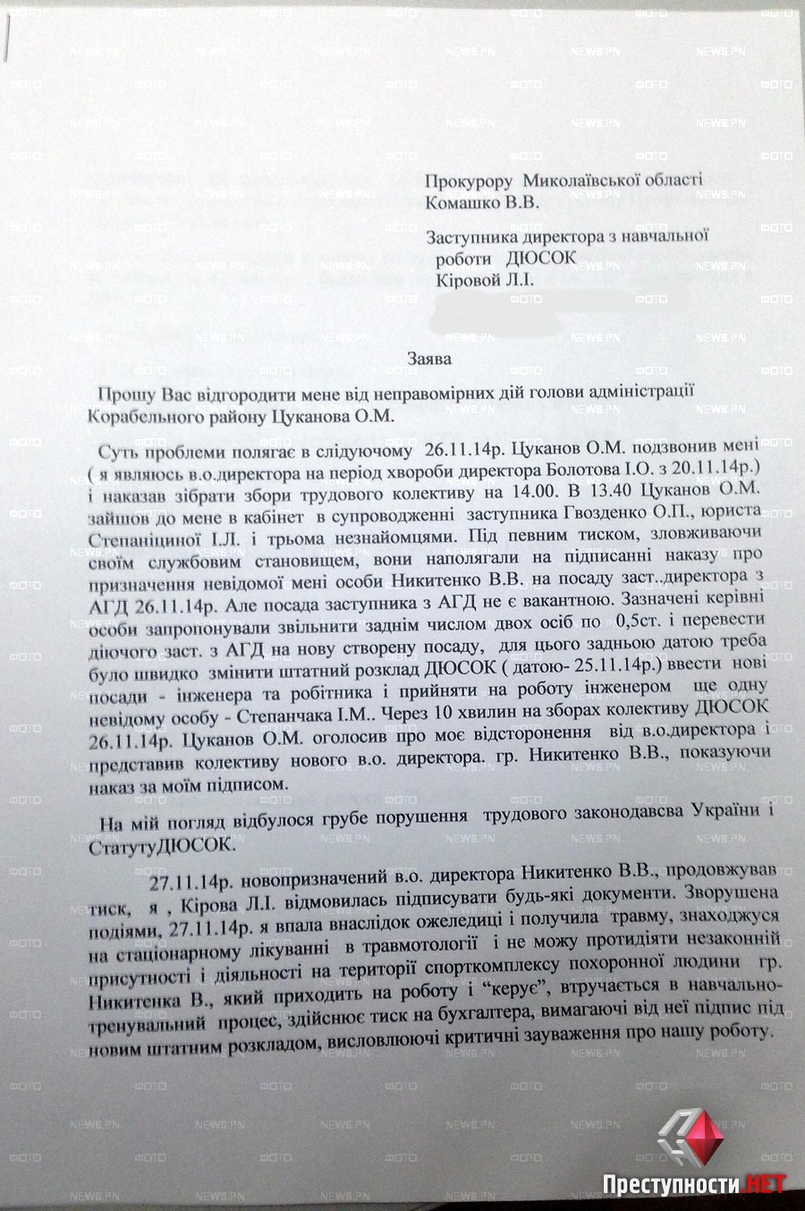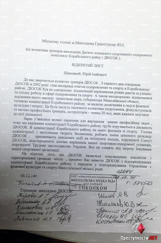– В администрации Корабельного района нет специалистов по спорту. Глава администрации (Александр Цуканов - ПН) и заместители творят беззаконие, вносят изменения в штатное расписание ДЮСОК, назначают неизвестных лиц на несуществующие должности, нарушая устав ДЮСОК, отстраняя действующих руководителей нашего спортивно-оздоровительного учреждения, нарушая Трудовое законодательство Украины. Все это ставит под угрозу существование нашей спортивной организации, - говорится в письме.