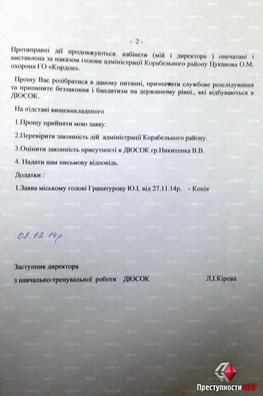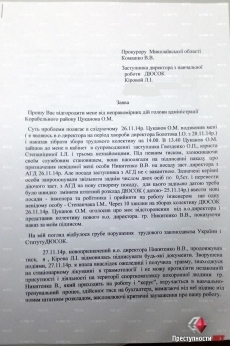 Кроме того, заместитель директора по учебно-воспитательной работе Людмила Кирова направила письмо прокурору Николаевской области Владимиру Комашко с требованием проверить законность действий главы Корабельной райадминистрации Александра Цуканова, который, по словам Кировой, в нарушение трудового законодательства и устава ДЮСОК отстранил ее от выполнения обязанностей директора и назначил постороннего человека Виктора Никитенко. Кроме того, Кирова попросила прокурора оценить законность присутствия в ДЮСОК Никитенко.