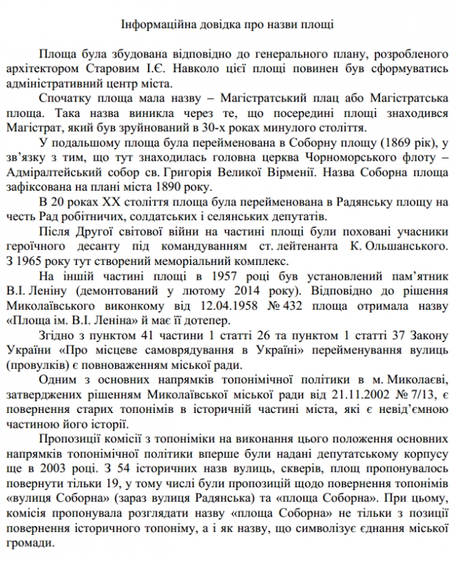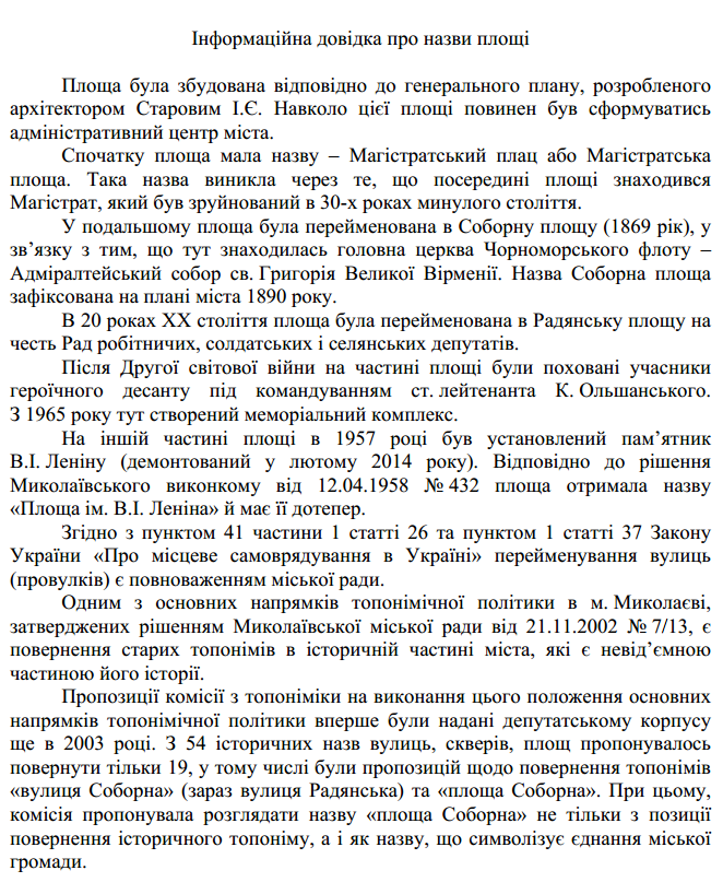 – С целью восстановления исторических традиций топонимики города Николаева, учитывая многочисленные обращения общественных организаций и жителей города, во исполнение протокольного поручения Николаевского городского совета от 11.12.2014 № 547/6 пр.д. начинается общественное обсуждение по возвращению площади Ленина исторического названия «Соборная площадь», - говорится в сообщении.