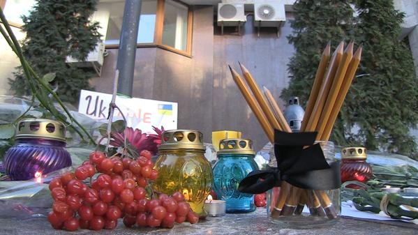 Киевляне, в знак солидарности, начали приносить к посольству цветы и свечи еще ночью.