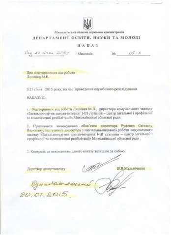 Председатель Николаевской областной государственной администрации Вадим Мериков объявил выговор директору департамента образования ОГА Валерию Мельниченко в связи со скандалом в школе-интернате №5.