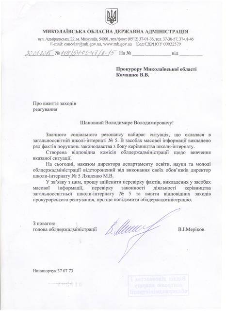 Вадим Мериков сообщил, что направил в прокуратуру Николаевской области обращение с целью проверки выявленных фактов. Он утверждает, что если информация подтвердится, руководитель учреждения будет наказан по всей строгости закона.