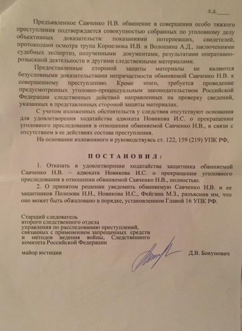 – Помните, мы подавали ходатайство о прекращении уголовного преследования в отношении Савченко в СК? Так вот, отказали, - сказано в сообщении.