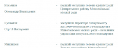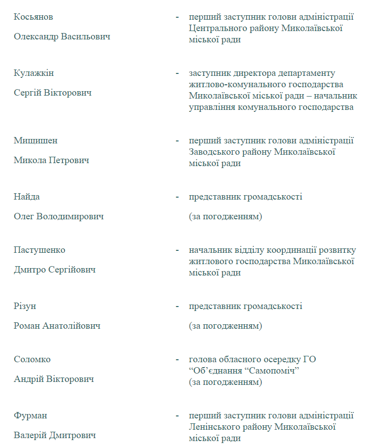 Остальные члены рабочей группы – чиновники. Это – первый заместитель главы администрации Корабельного района Александр Гвозденко, первый заместитель главы администрации Центрального района Александр Косьянов, первый заместитель главы администрации Заводского района Николай Мищишен, первый заместитель главы администрации Ленинского района Валерий Фурман, заместитель директора Департамента ЖКХ горсовета Сергей Кулажкин, начальник отдела координации развития жилищного хозяйства горсовета Дмитрий Пастушенко, начальник управления по контролю за ремонтом, реконструкцией, строительством, газификацией коммунальных объектов и жилья при Департаменте ЖКХ горсовета Сергей Чуб.
