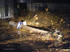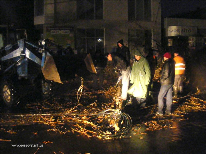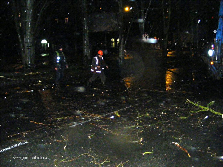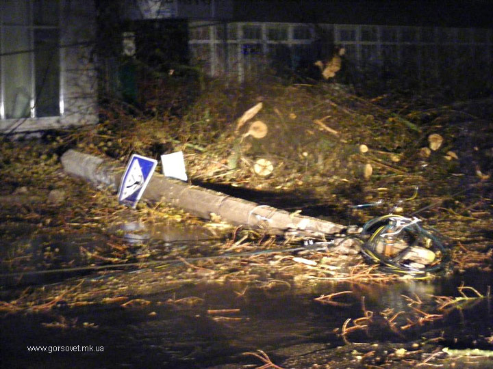 В 17:51 поступило сообщение о падении огромного дерева и бетонного столба на пересечении улицы Московской и улицы Потемкинской на трамвайную линию. Поврежден контактный провод электропитания трамвая, сети наружного освещения и воздушная кабельная линия. Сотрудники ГАИ оперативно перекрыли движение по ул.Московской от ул.Шевченко до ул. Потемкинской. Бойцы аварийно-спасательного отряда специального назначения распилили дерево и расчистили дорогу, затем бригады КП «Николаевэлектротранс», КП «ХУМС» и ПАТ «Николаевобленерго» обесточили порванные провода. Уже в темноте работники КП «Николаевэлектротранс» оттащили с проезжей части упавшую опору и убрали провода. В 21:30 движение транспорта по ул.Московской и ул.Потемкинской было возобновлено.