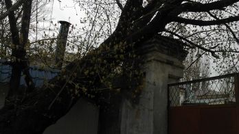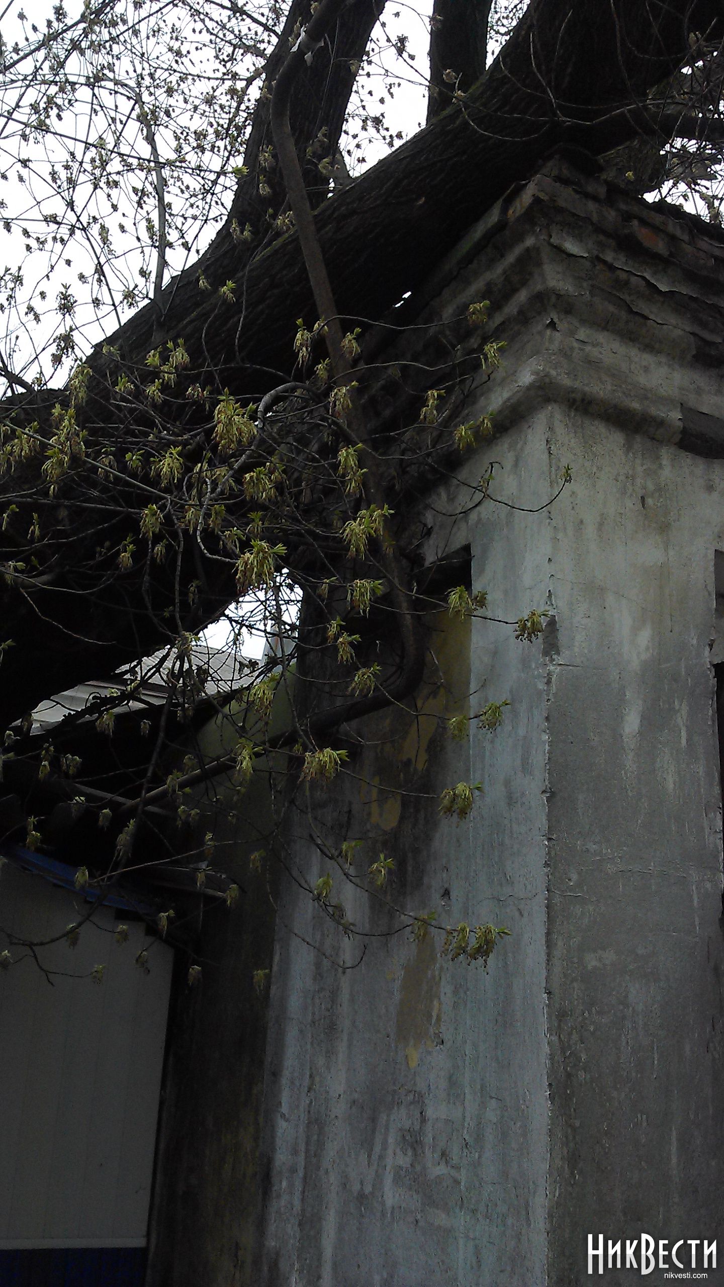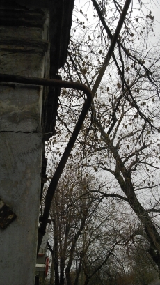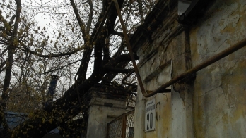 Сам ствол завалится на кирпичную стену, заметно повредив газовую трубу, которая отклонилась сантиметров на 30-40 от своего прежнего состояния, а упавшие ветки порвали один из многочисленных электрических проводов.