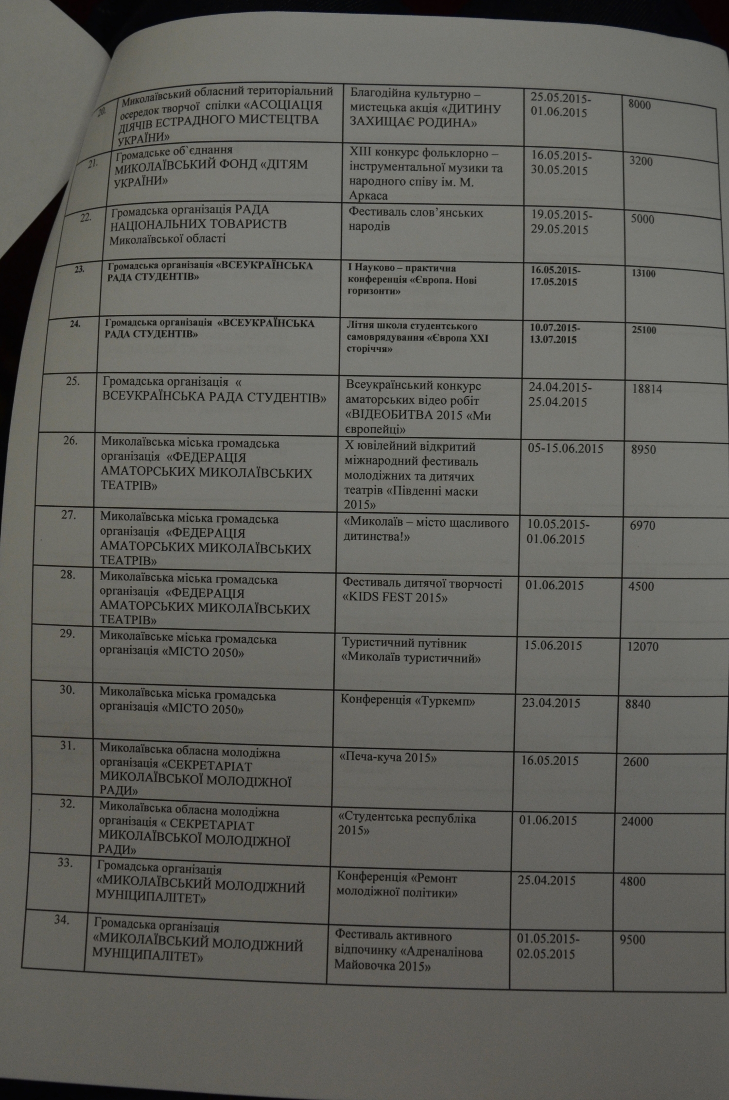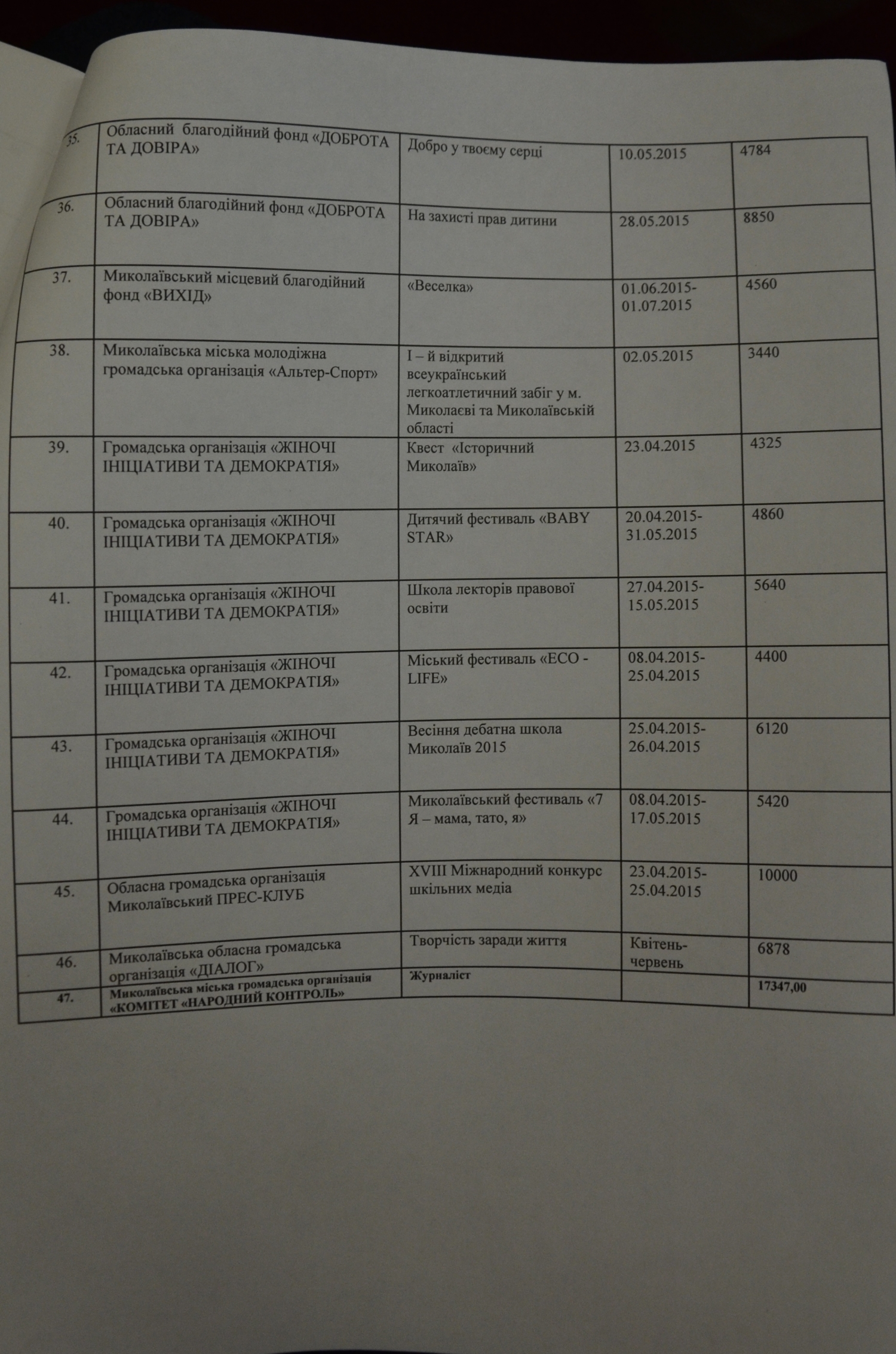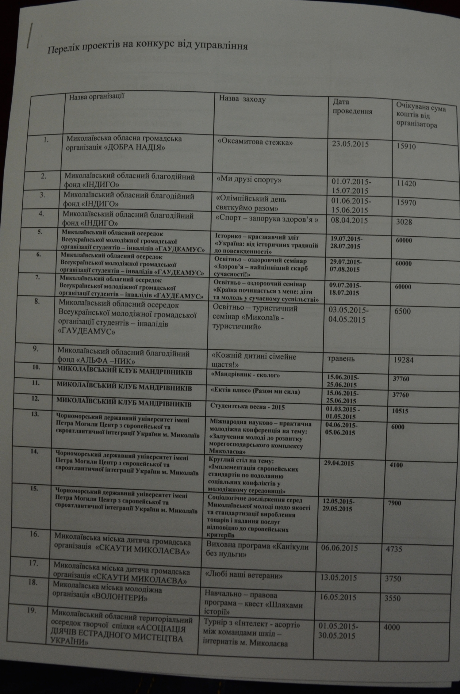 Таким образом, конкурсная комиссия, оценивающая проекты, состояла из 11 человек, в нее вошли 5 чиновников: и.о. вице-мэра Евгений Шевченко, начальник управления по делам семьи, детей и молодежи Вадим Дяченко, начальник отдела по работе с молодежными организациями Николай Никитин, начальник отдела общественных связей Наталья Ухмановская, главный специалист областного управления молодежи Олег Соколик, а также 6 представителей от общественности: советник мэра Катерина Колесниченко, советник губернатора Александра Лемишевская, зампредседателя совета по молодежной политике при мэре Анна Ганжул, николаевский общественник Александр Максименко, украинская легкоатлетка Инга Бабакова и депутат городского совета Татьяна Чистякова.