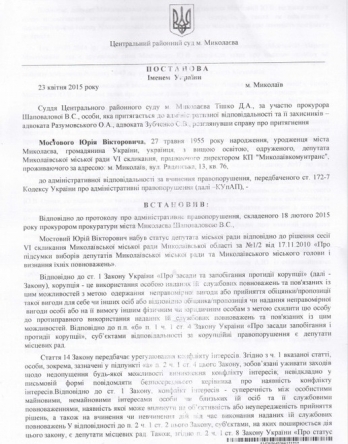 Судья Центрального районного суда Николаева Дмитрий Тишко 23 апреля постановил закрыть производство в деле по привлечению депутата горсовета Юрия Мостового к административной ответственности за коррупцию в части возможного конфликта интересов при голосовании на сессиях.