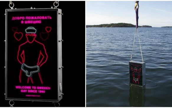 Как сообщает ТСН, для этого в море был опущен неоновый щит, на котором изображен моряк-гей с приветственной надписью на русском языке.
