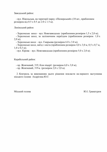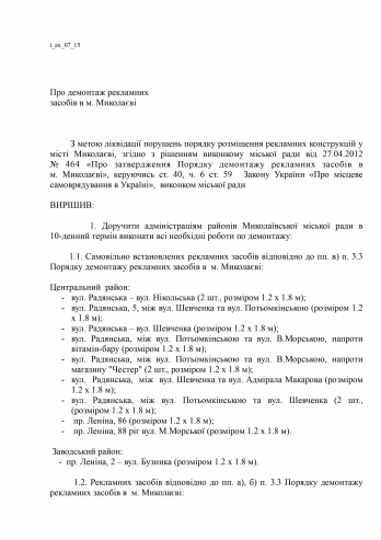 В документе указывается, что работы по демонтажу указанных объектов должны быть проведены администрациями районов на протяжении 10 дней после принятия решения исполкомом. Контроль за выполнением решения будет возложен на первого заместителя Николаевского городского головы Юрия Андриенко.