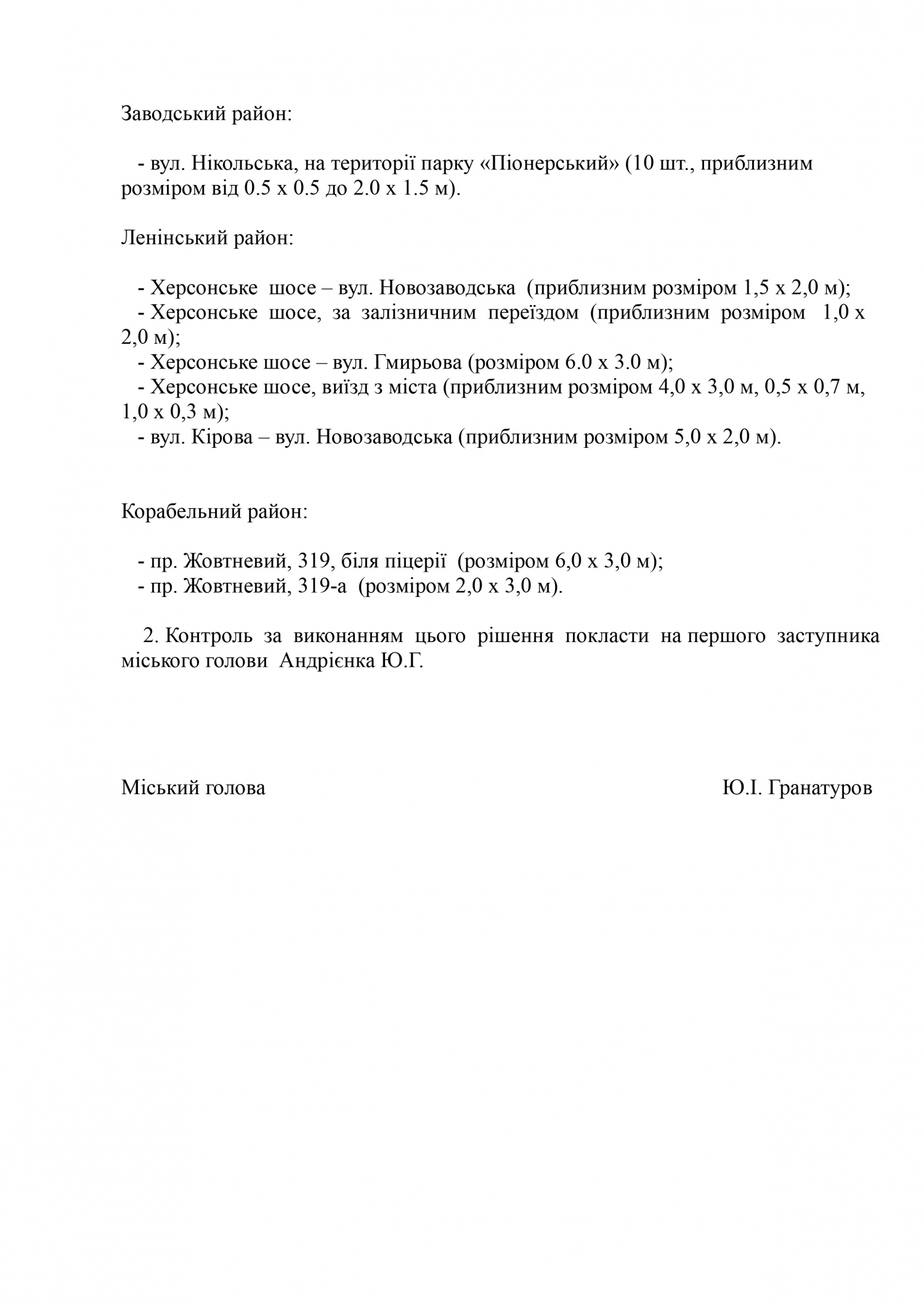 — Херсонское шоссе, выезд из города (3 шт., приблизительный размер 4,0 х 3,0 м, 0,5 х 0,7 м, 1,0 х 0,3 м);