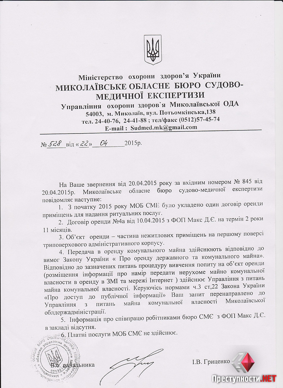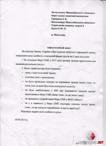 Так, из ответа бюро СМЭ на информационный запрос следует, что с начала этого года бюро заключило договор аренды помещений для предоставления ритуальных услуг с ФЛП Макс Д.Е. сроком на 2 года 11 месяцев. Объектом аренды является часть нежилых помещений. При этом именно на этих площадях размещаются холодильники для хранения тел умерших, однако в договоре нет ни слова об имуществе учреждения здравоохранения.
