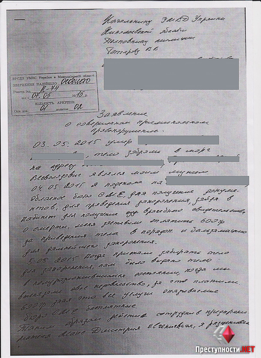 По факту вымогательства средств за услуги, которые должны быть бесплатными, а также по факту выдачи полуразложившегося тела родственники умершего обратились к начальнику УМВД Украины в Николаевской области Виталию Гончарову.