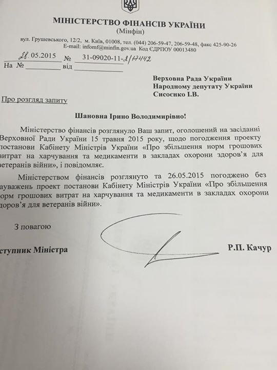«Если долго мучиться, что-нибудь получится…. В результате моих многих обращений, брифингов в ВРУ, все-таки результат есть! Минфин согласовал увеличение финансирования на питание и медикаменты для участников АТО в госпитали ветеранов войны и участников АТО», - написала народный депутат.
