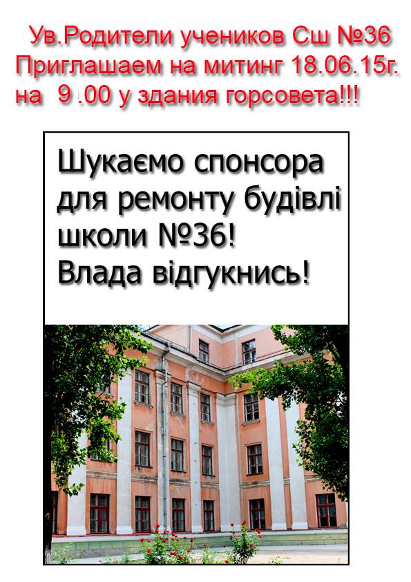 Родители учащихся школы №36 призывают всех неравнодушных к проблеме ремонта здания школы на митинг, который состоится 18 июня в 9.00 возле здания городского совета.