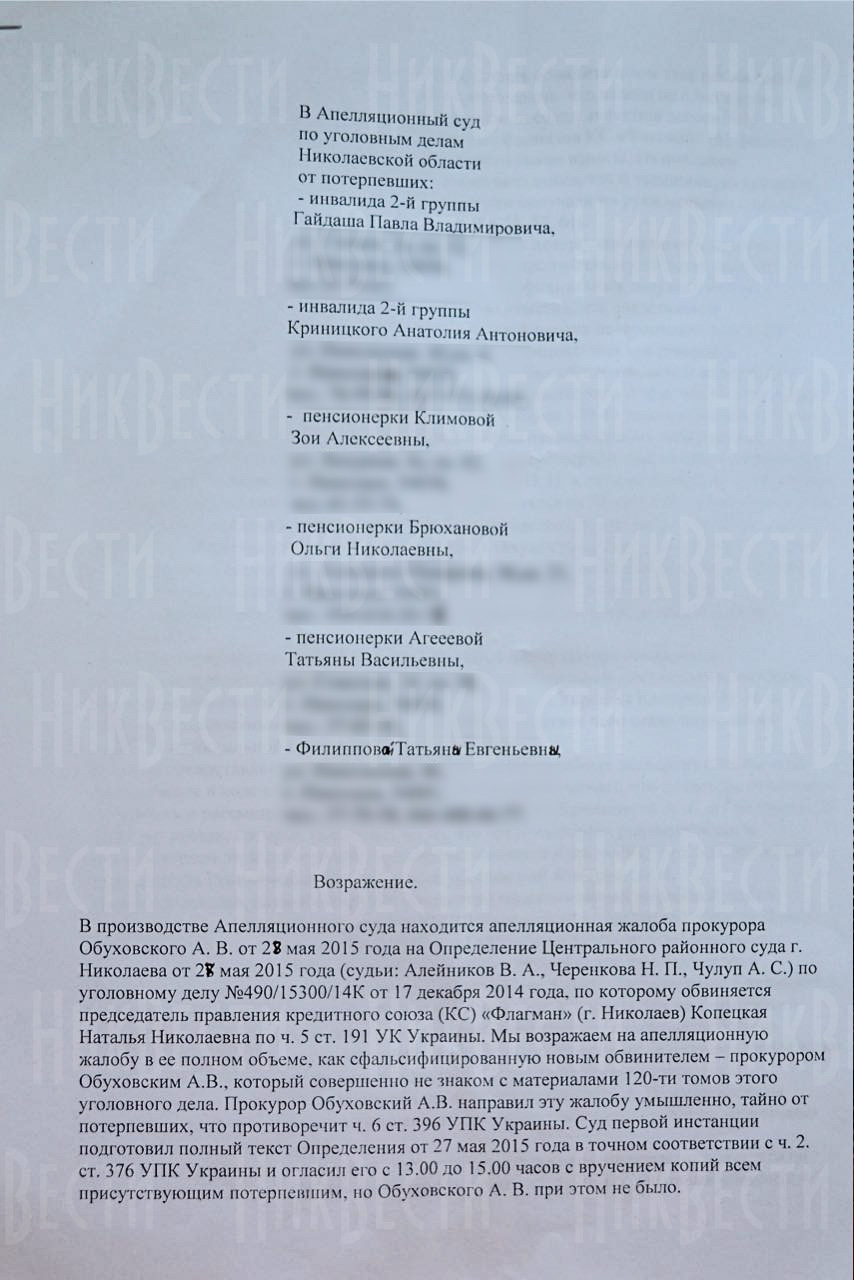 Обманутые вкладчики кредитного союза считают жалобу прокурора фальсифицированной и такой, что отправлена умышленно и в тайне от потерпевших, что противоречит части 6 статьи 396 УПК Украины.