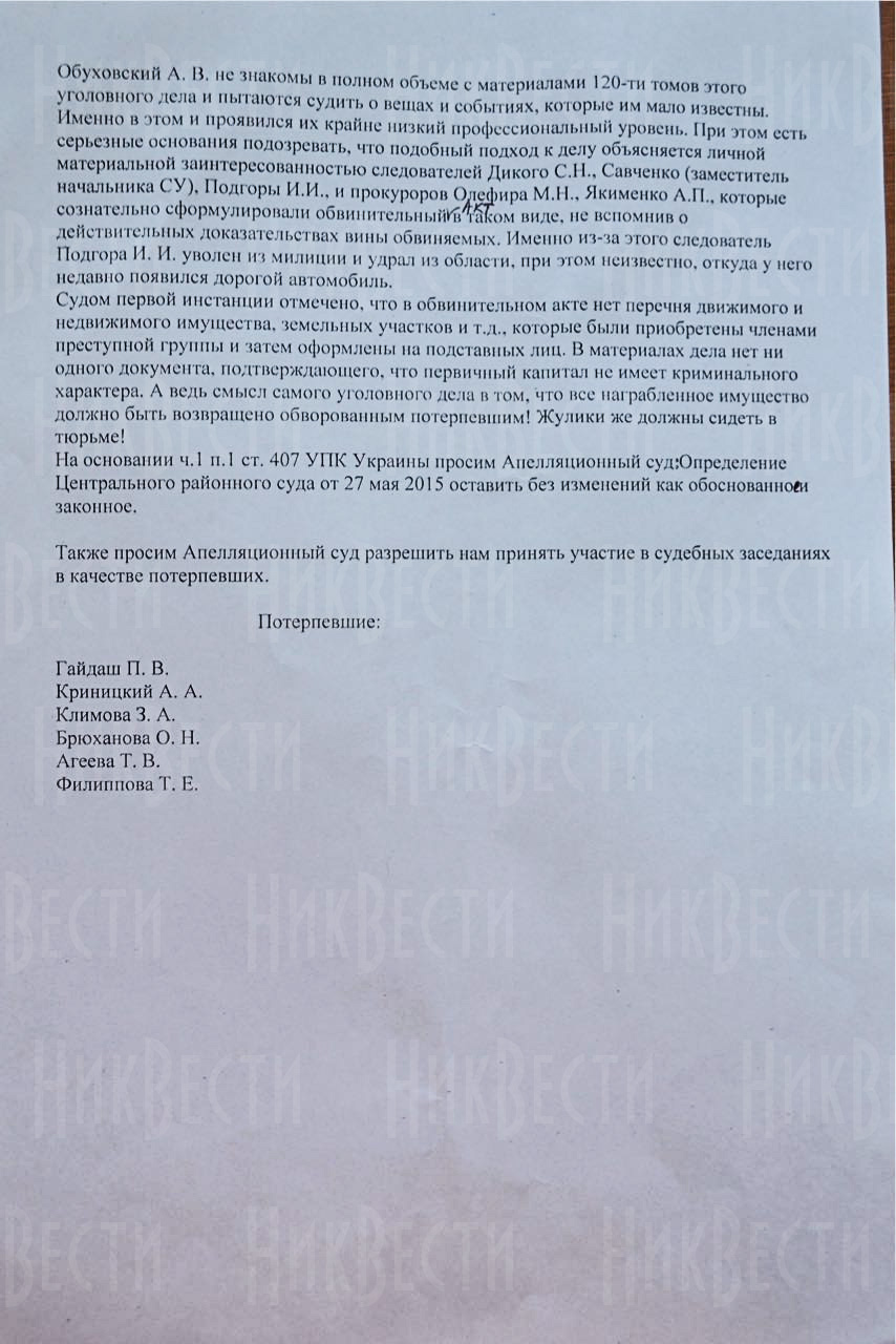 «Если суд первой инстанции в своем Определении от 27 мая 2015 года встал на защиту нарушенных прав как потерпевших, так и обвиняемой, то апелляционная жалоба Обуховского А.В. направлена на защиту чести своего изрядно загрязненного прокурорского «мундира» и на «похороны» всего этого уголовного дела», - считают представители инициативной группы потерпевших.