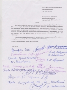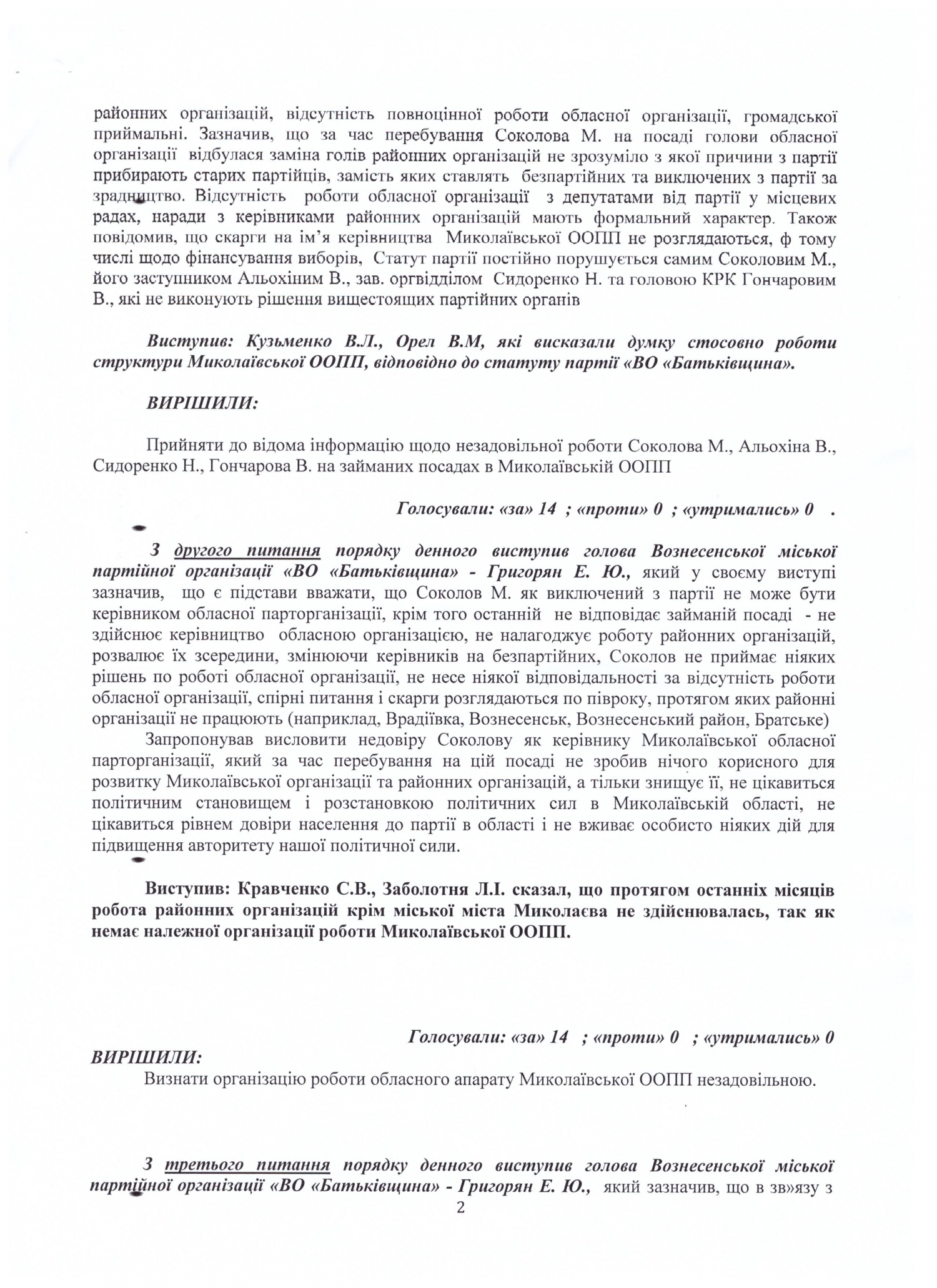Члены Президиума, подгоняемые Соколовым, закрывшемся в офисе от партийцев, загородившемся от них спинами охранников, так спешили, что даже не успели подписать документ. Отправили по электронной почте так - без подписи Тимошенко, узнавшей позже о принятом решении, пусть даже оно и касается члена партии, имеющего не только статус главы местной парторганизации, но и депутата областного совета от партии - единственного представителя партии во фракции «ВО «Батьківщина» (которой осталось из-за такого решения существовать несколько дней). Это называется проявление демократии в её высшей степени.