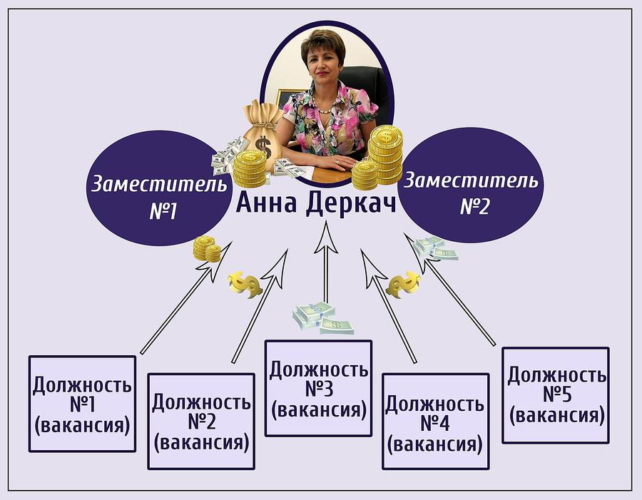Начальница Управления образования Николаевского городского совета Анна Деркач незаконно начисляла себе 2 зарплаты вместо одной за счет того, что умышленно не заполняла 5 вакансий, среди которых были 2 ее заместителя. Сэкономленные деньги вместо премирования учителей или своих подчиненных Деркач присваивала себе в качестве премий размером часто выше самой зарплаты со всеми начислениями.