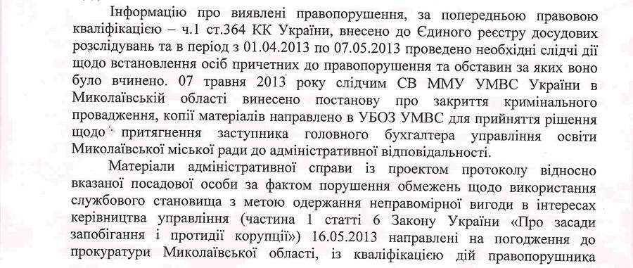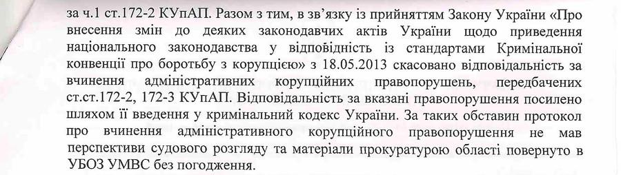 В результате и заместителя главного бухгалтера гороно к ответственности так и не привлекли. Материалы административного дела с проектом протокола в отношении него 16 мая 2013 года были направлены на согласование в прокуратуру Николаевской области. Вместе с тем, как отвечает главный николаевский милиционер Гончаров, в связи с принятием Закона Украины «О внесении изменений в некоторые законодательные акты Украины по приведению национального законодательства в соответствие со стандартами Криминальной конвенции о борьбе с коррупцией» с 18 мая 2013 года была отменена ответственность за совершение административных коррупционных правонарушений, предусмотренных статьями 172-2 и 172-3 КУоАП.