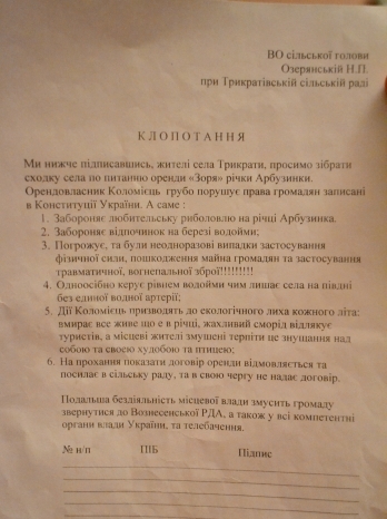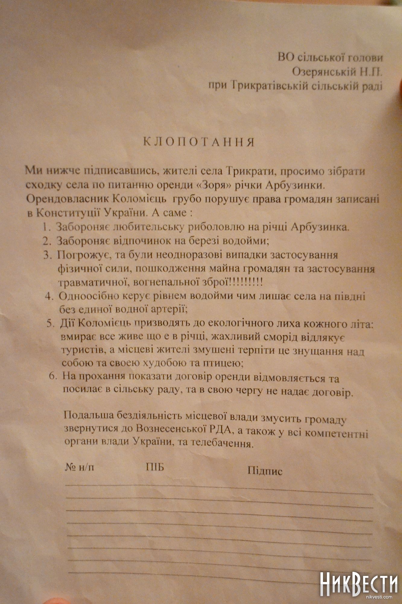 Он пришел на встречу с собранными подписями жителей села, требующих организовать встречу по вопросу грубого нарушения со стороны арендатора ставка «Заря», находящегося около Трикрат. По словам жителей села, водоем был создан путем перекрытия течения реки Арбузинка, в результате чего река начала пересыхать. Селянин сообщил, что арендатор водоема запрещает жителям села ловить рыбу и отдыхать на берегу реки. Также отмечается, что на просьбу жителей предоставить договор аренды, он направляет их в сельской совет, который в свою очередь, разводит руками и не спешит помочь им.