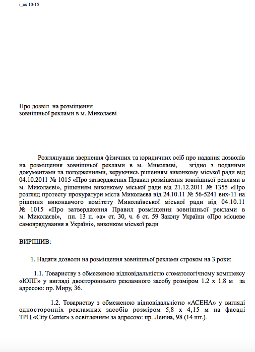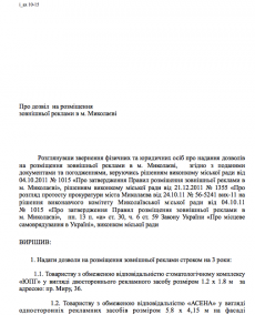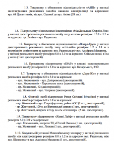 4. Предприятию с иностранными инвестициями «МакДональдз Юкрейн Лтд» в виде двустороннего рекламного средства типа «пилон» размером 15.0 х 1.5 м по адресу: проспект Ленина - ул. Советская.