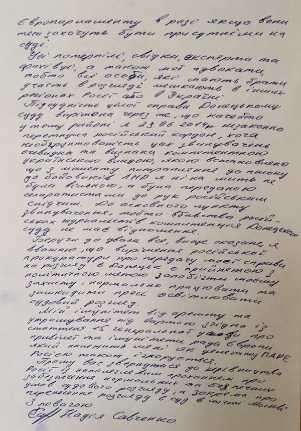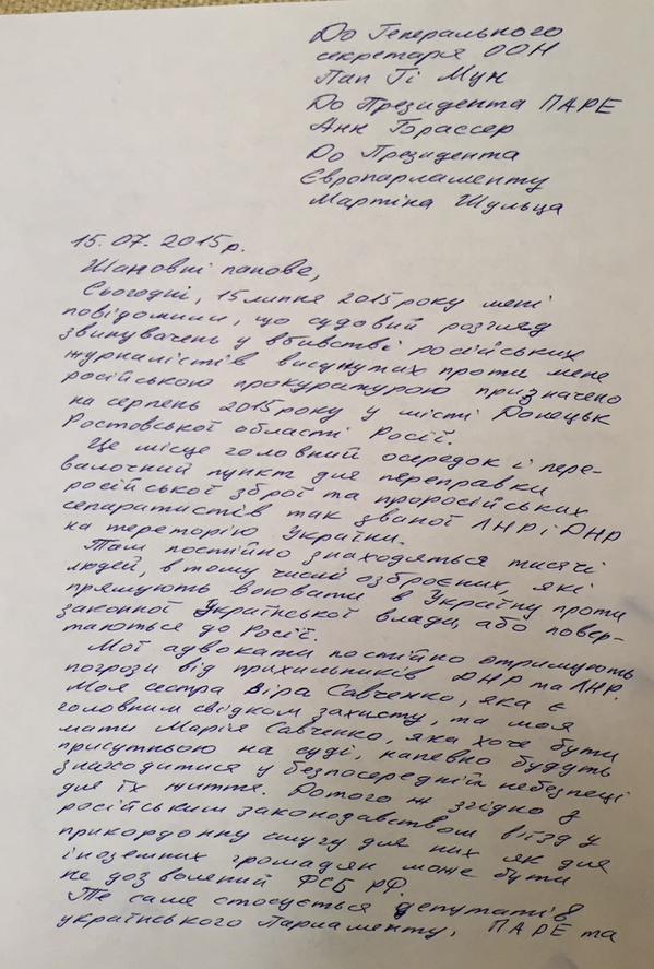 — Прошу вас обратиться к руководству России с настоятельной просьбой об обеспечении нормальных и безопасных условий судебного разбирательства, а в частности о переносе рассмотрения в суд в городе Москва, — попросила Савченко.