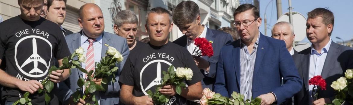 Сегодня, 17 июля, утром народные депутаты и дипломаты собрались возле посольства Нидерландов в Киеве, чтобы почтить жертв катастрофы Boeing 777, которая произошла год назад, 17 июля 2014 года.