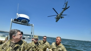 Президент Украины Петр Порошенко в Николаевской области наблюдает за ходом тактических учений Военно-морских сил Украины.