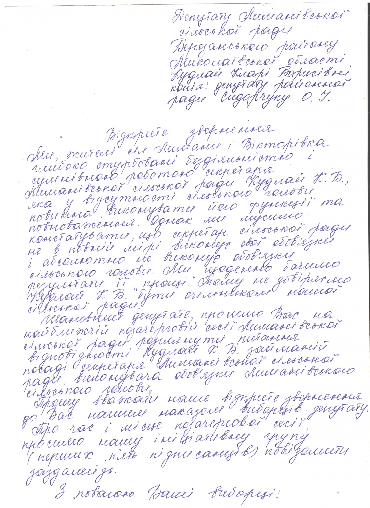 Инициативная группа из села Лиманы Березанского района в течение трех дней собрала больше 200 подписей жителей Лимановского сельского совета к депутатам с просьбой созвать внеочередную сессию сельского совета, чтобы рассмотреть вопрос соответствия Клары Кудлай занимаемой должности секретаря сельсовета, которая с апреля этого года дополнительно выполняет функции сельского головы.