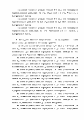 Проектом решения планируется утвердить техническую документацию по землеустройству и разрешить предпринимателю Александру Гордиенко заключение договора об установке личного срочного сервитута сроком на 1 год для размещения передвижных временных сооружений в количестве 7 штук (каждое площадью 1,75 м2) для осуществления предпринимательской деятельности, в Центральном районе по таким адресам: улица Советская, угол Потемкинской; улица Советская, угол Шевченко; Советская, около дома №5; Советская, угол Спасской; Советская, угол проспекта Ленина; Советская, около магазина «Сотка», Советская, угол улицы Адмирала Макарова.