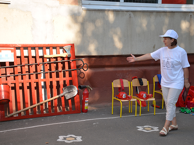 Сообщается, что на площадке собралось немало малышей, с удовольствием наблюдающих за выступлением ведущей, которая рассказывала о снаряжении, размещенном на пожарном щите в их саду.