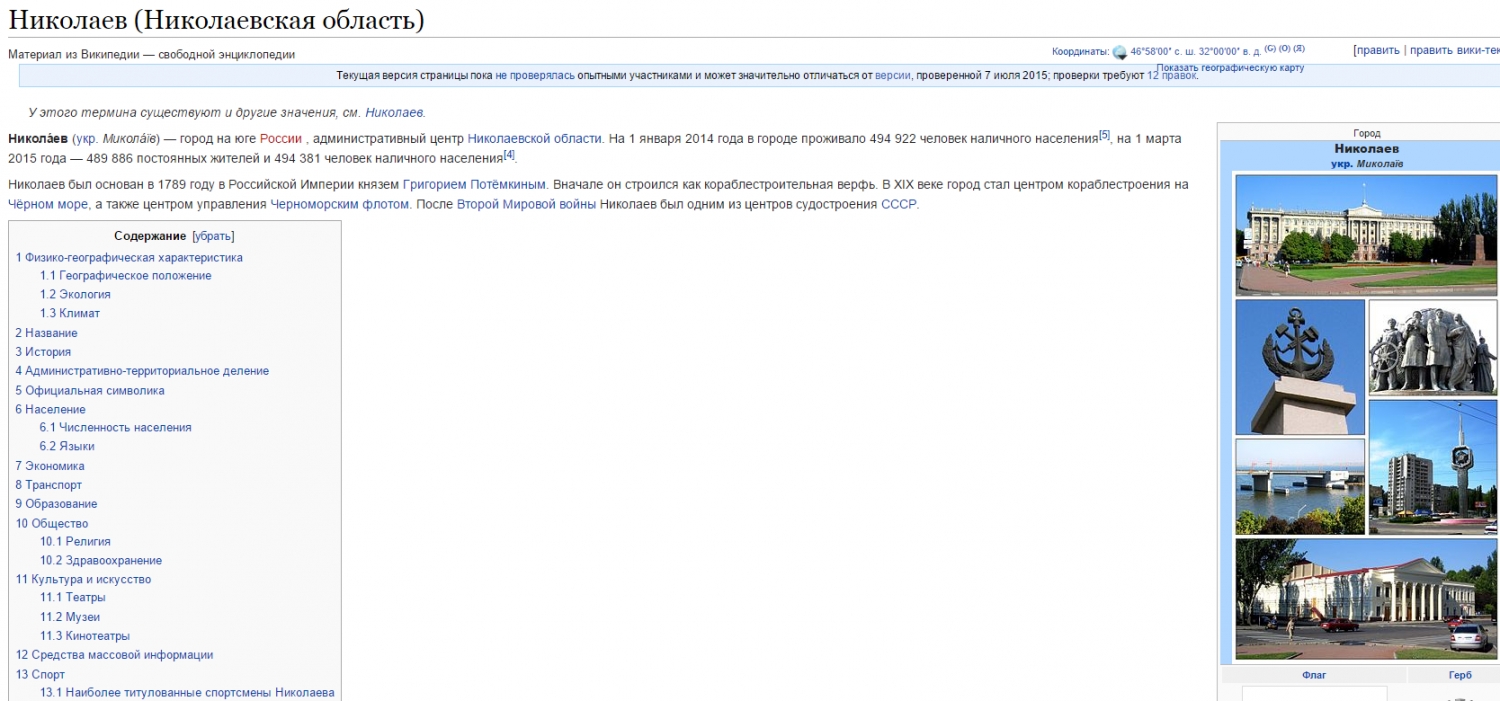 В русской Википедии город Украины Николаев, являющийся областным центром, территориально причислили к России.