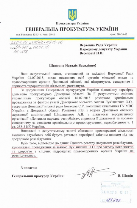 «Следственным управлением 16 июля 2015 года начато криминальное производство по фактам участия Донецкого городского головы Александра Лукьянченко, секретаря Донецкого городского совета Сергей Богачева, бывшего начальника Главного управления Министерства внутренних дел Украины в Донецкой области Романа Романова, главы Донецкой облгосадминистрации Андрея Шишацкого в деятельности террористической организации «ДНР», содействия ее деятельности и проявлениям сепаратизма», — сказано в ответе прокуратуры на депутатский запрос.