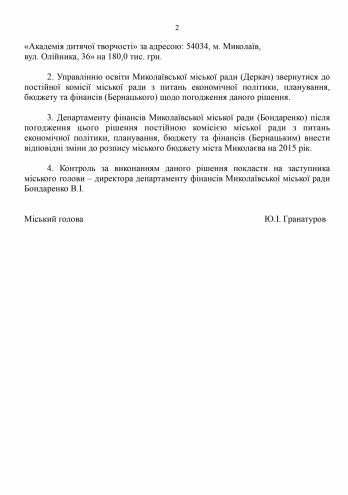 Данным решением планируется уменьшить расходы по строительству учебных помещений для развития творческого потенциала учеников с инклюзивной формой образования специализированной школы «Академия детского творчества» на 180 тысяч гривен.
