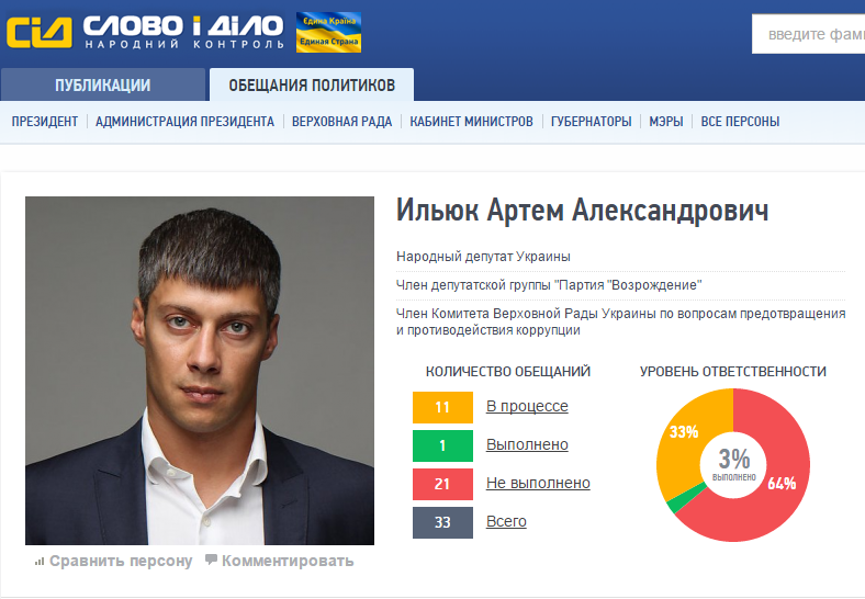«Слово и дело» констатировали, что суммарный показатель безответственности Артема Ильюка составляет 64% - они изучали декларации и обещания политика на протяжении всех его каденций. Отдельно общественник озвучил, что лидером уровня ответственности является Андрей Вадатурский, который прошел в Раду по 130 округу.
