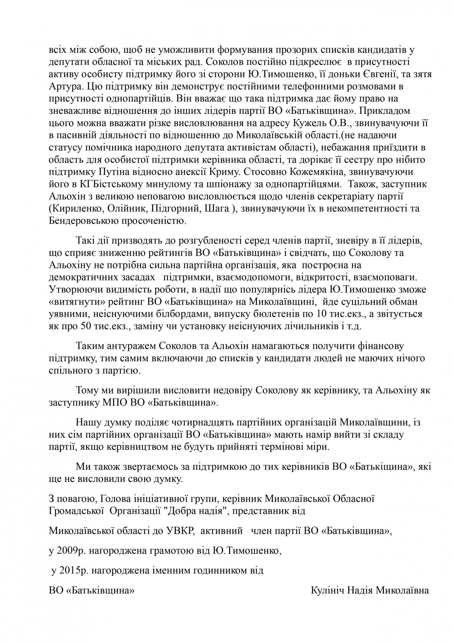 "Практически на протяжении последних восьми-девяти месяцев Соколов отсутствовал и приезжал два-три раза на несколько часов. Соколов и Алехин пытаются получити финансовую поддержку, тем самым включая в списки в кандидаты в депутаты людей, не имеющих ничего общего с партией. Поэтому мы решили выразить недоверие Соколову как руководителю и Алехину как заместителю НПО ВО «Батьківщина». Наше мнение разделяет четырнадцать партийных организаций Николаевщины, из них семь партийных организации ВО «Батькивщина» намерены выйти из состава партии, если руководством не будут приняты срочные меры", - сказано в письме.