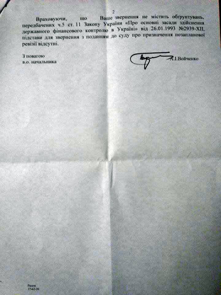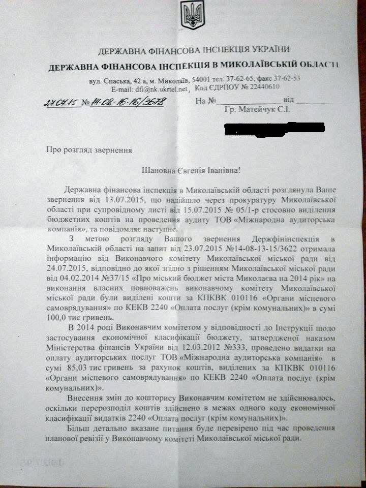 «ДемАльянс» получил ответ из Государственной финансовой инспекции Николаевской области по поводу обращения в прокуратуру с просьбой проверить законность действий Юрия Андриенко, Александра Женжерухи и Инны Бычковской по фактам перераспределения бюджетных средств по заказу аудита в ООО «Международная аудиторская компания», на что было выделено 85 тысяч гривен бюджетных средств.