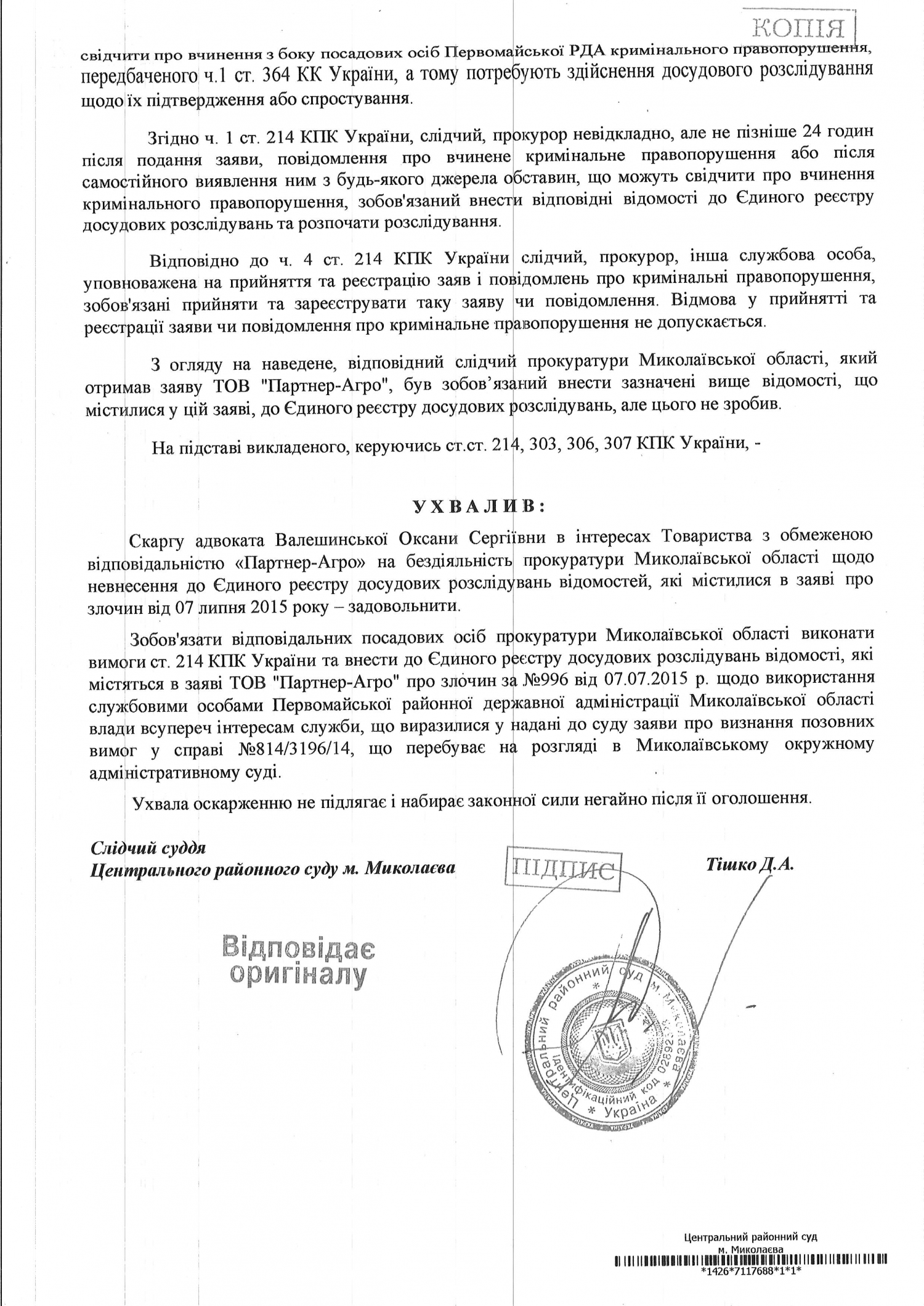 Центральный районный суд Николаева принял решение обязать уполномоченное лицо прокуратуры Николаевской области внести в Единый реестр досудебных расследований сведения об уголовном правонарушении согласно заявления ООО «Партнер - Агро» относительно экс-главы Первомайской районной государственной администрации Николаевской области Виктора Сироты по статье 364 Уголовного кодекса Украины («Злоупотребление властью или служебным положением»).