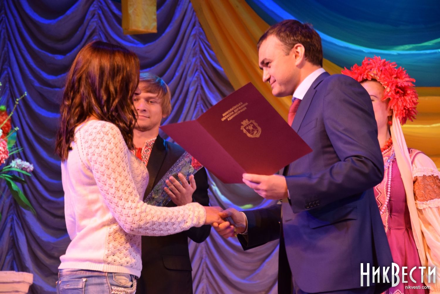 Вадим Мериков вручил Почетные грамоты участнику антитеррористической операции, машинисту-трактористу фермерского хозяйства «Гармония» Снигиревского района Дмитрию Козлюку, участнику АТО, механизатору и водителю фермерского хозяйства «София-2008» Очаковского района Руслану Саковскому, а также спортсменке по прыжкам в воду комплексной детско-юношеской спортивной школы физкультурно-спортивного сообщества «Украина» Диане Шелестюк.