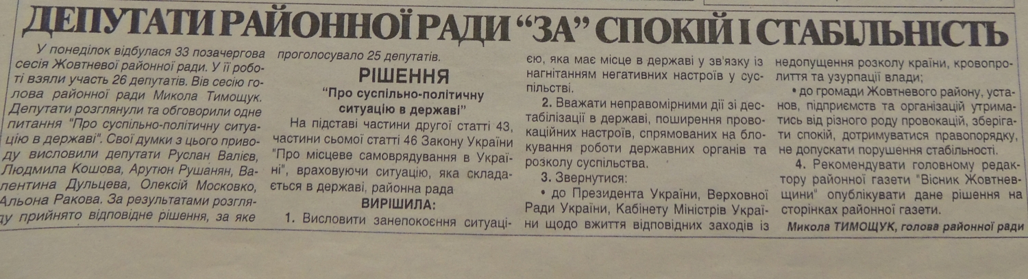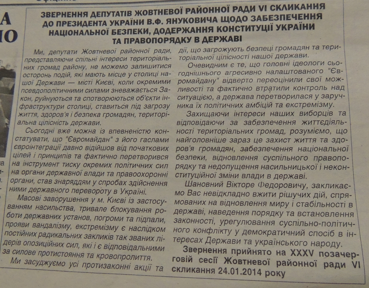 Председатель Жовтневого районного отделения «ДемАльянса» Игорь Финкельштейн утверждает, что эти депутаты на 33 и 34 внеочередных сессиях Жовтневого райсовета, которые проходили 24 декабря 2013 года и 24 января 2014 года, поддержали обращение к тогдашнему президенту Виктору Януковичу «за спокойствие и стабильность».