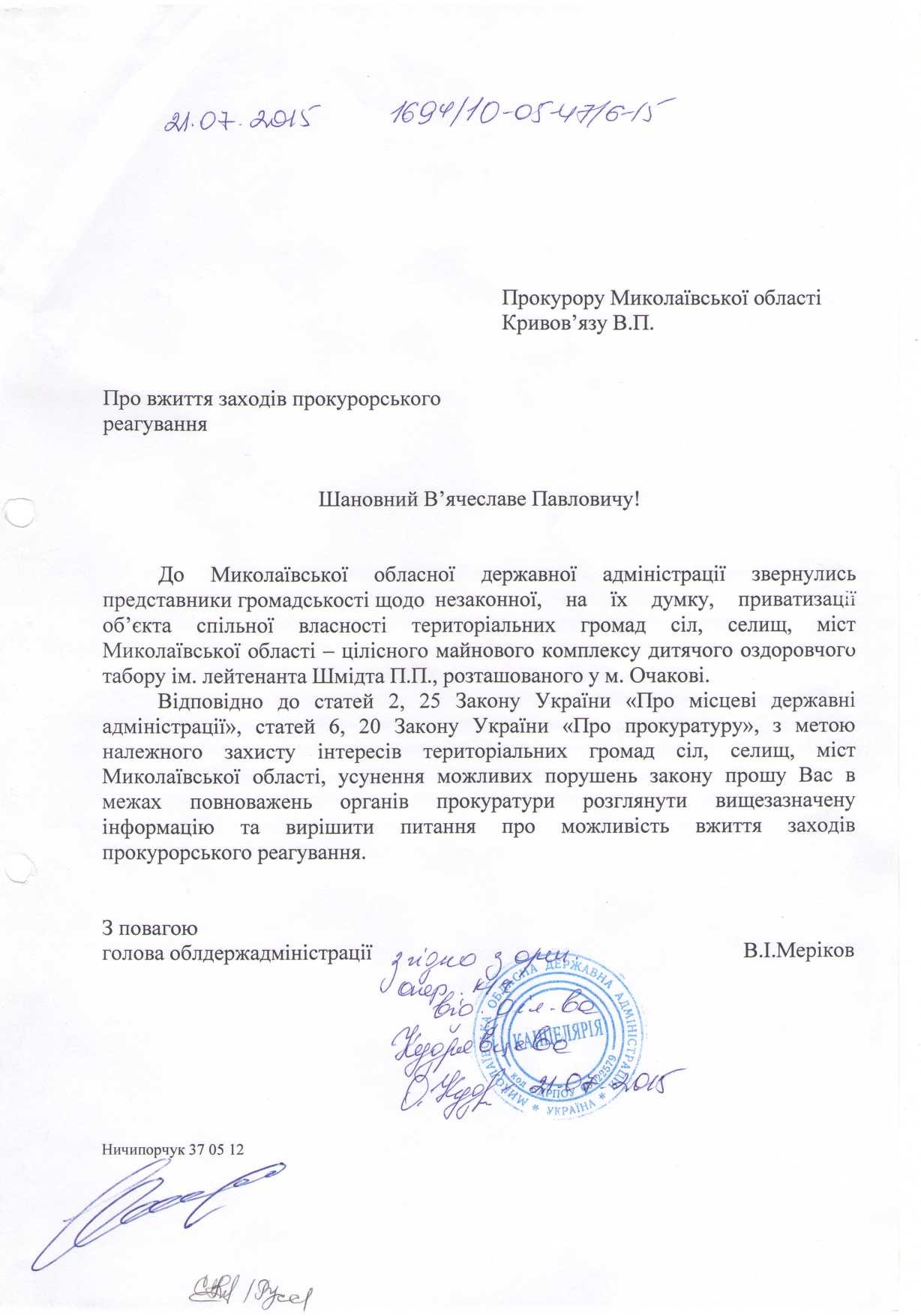 Помощница губернатора передала НикВестям копию обращения председателя Николаевской ОГА Вадима Мерикова к прокурору области Вячеславу Кривовязу относительно принятия мер прокурорского реагирования по данному вопросу.