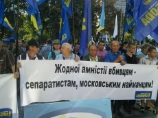 Кроме того, активисты «Свободы» призывают не вводить амнистию для сепаратистов. Они скандируют: «Слава Украине! Героям Слава».
