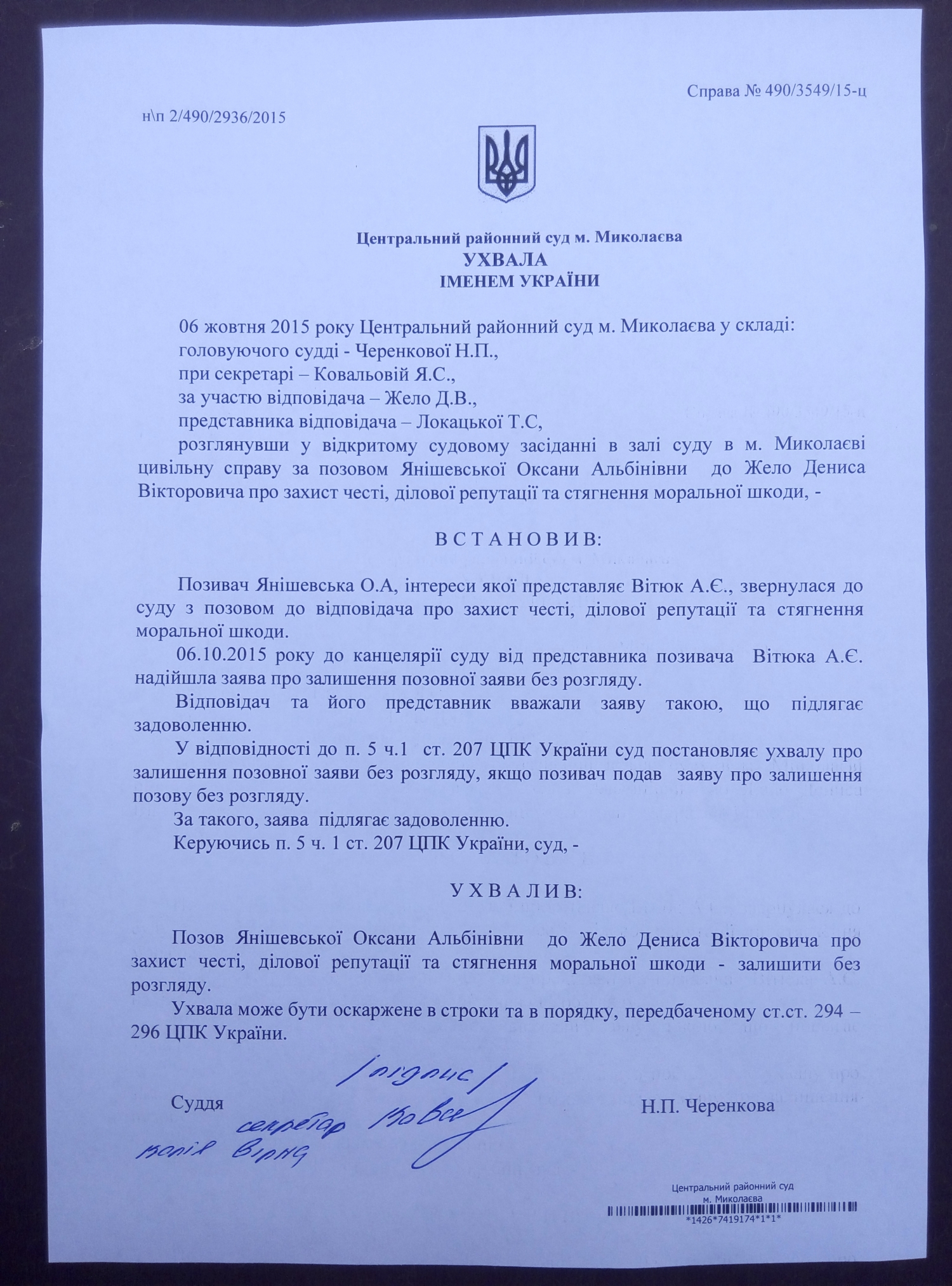 Заместитель председателя Николаевской облгосадминистрации Оксана Янишевская попросила суд оставить без рассмотрения ее иск к общественному активисту Денису Жело, который, по мнению чиновницы, пытался нанести вред ее деловой репутации.