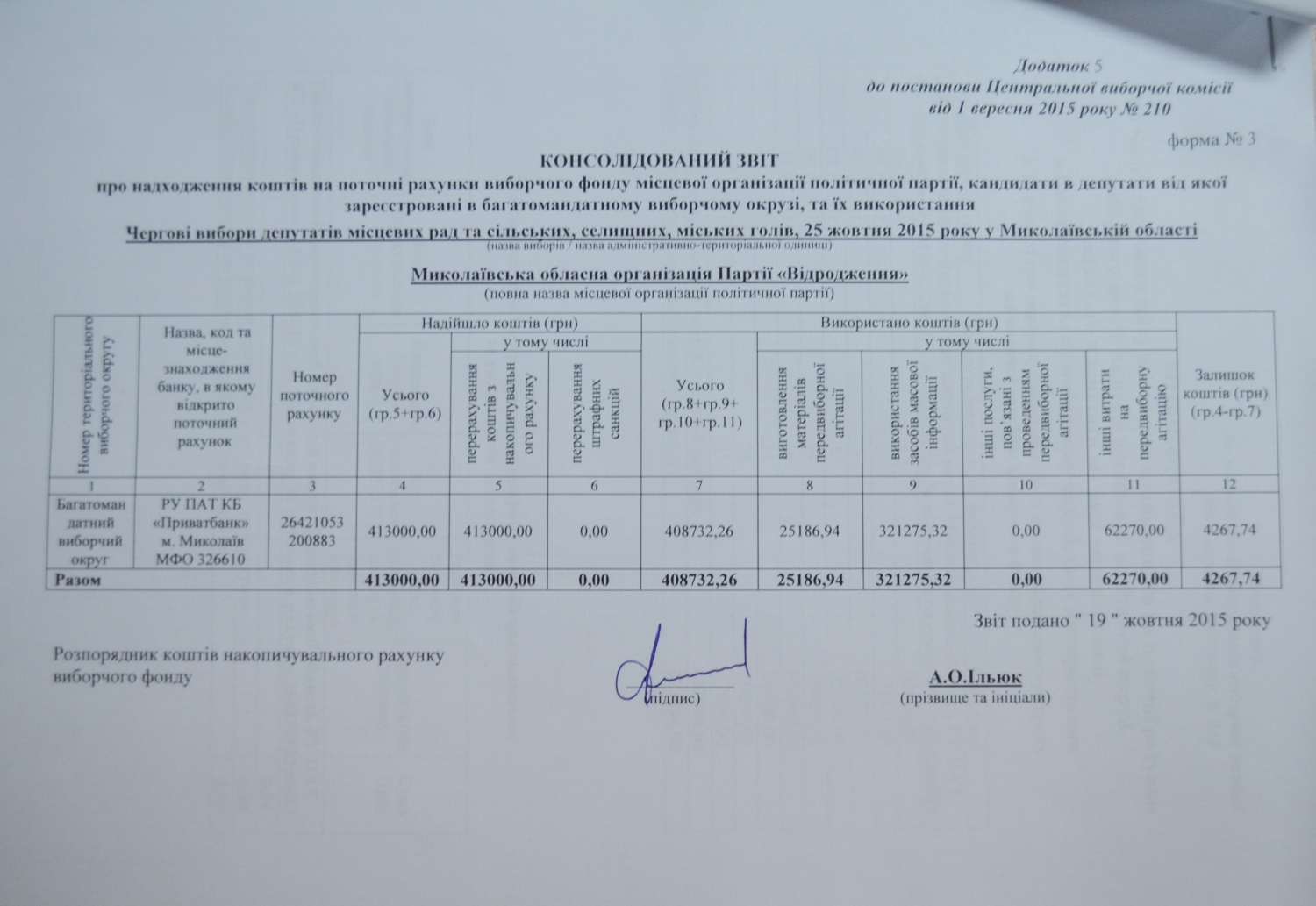В документе указывается, что средства были потрачены на оплату за публикацию агитационных материалов в газетах «Рідне Прибужжя», «Вперед», «Южная Правда», «День за днем», «Вечерний Николаев», «Николаевские новости», а также оплату эфирного времени на телеканалах «НИС-ТВ» и «1+1».