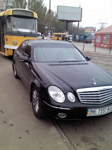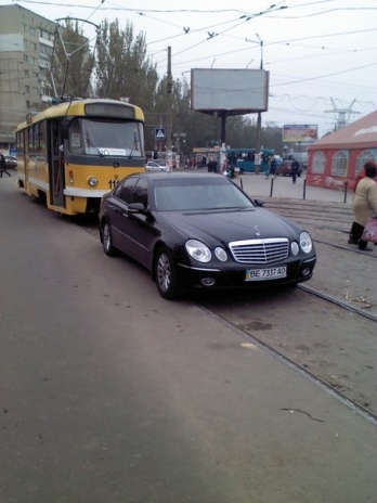 В Николаеве водитель автомобиля «Mercedes» припарковал свой автомобиль непосредственно на трамвайных путях, перекрыв дорогу электротранспорту.