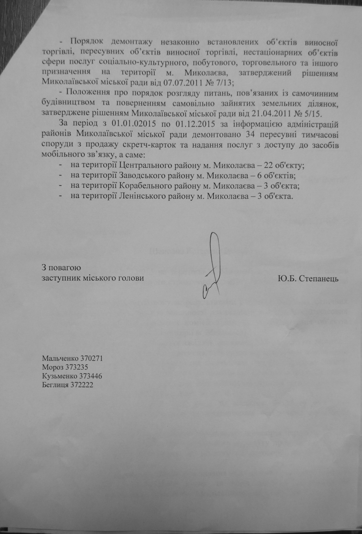 Заместитель Николаевского городского головы Юрий Степанец в ответе на информационный запрос НикВестей сообщил, что в этом году администрацией Корабельного района было демонтировано всего 3 киоска по продаже скретч-карточек и предоставлению услуг по доступу к средствам мобильной связи.