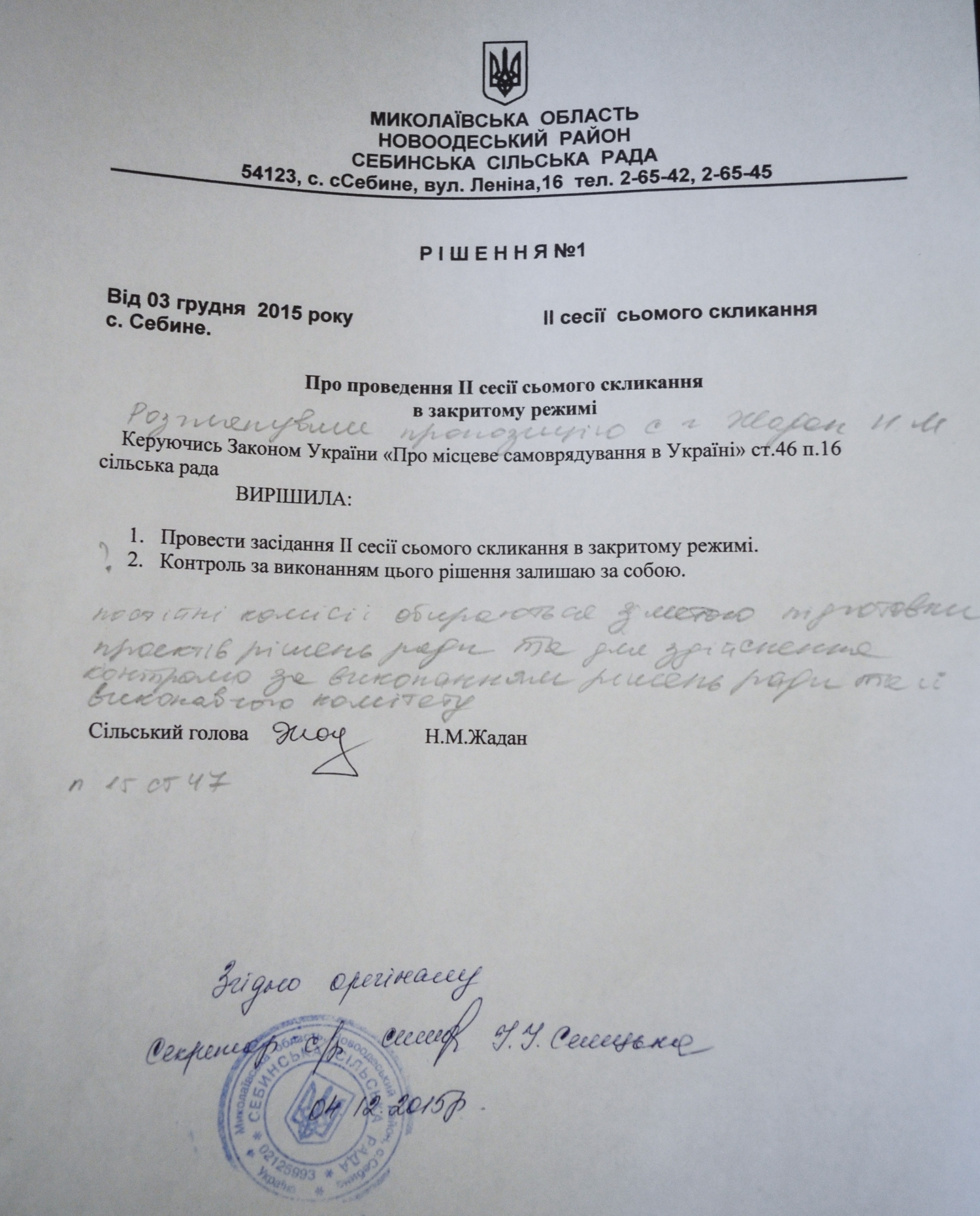 Но уже на следующий день, 4 декабря, депутат Наталья Ковальчук ознакомилось с текстом решения №1, подписанного сельским головой Натальей Жадан и секретарем сельского совета Инной Селецкой.