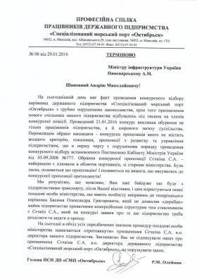 В связи с этим министру инфраструктуры Украины от имени Профсоюза работников предприятия сегодня было направлено обращение с просьбой не подписывать приказ о назначении Сечкина С.А. исполняющим обязанности директора порта «Октябрьск».